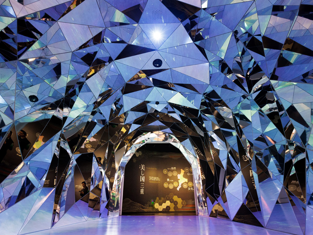 ブースの始まりは「時のトンネル」から。左右、そして頭上に広がるビジョンには、「熊野古道伊勢路」をはじめとする、県内29市町の代表的な観光地や、美しい自然の景観が幻想的に映し出され、会場にいながらまるで三重にトリップしたかのような体験ができます。