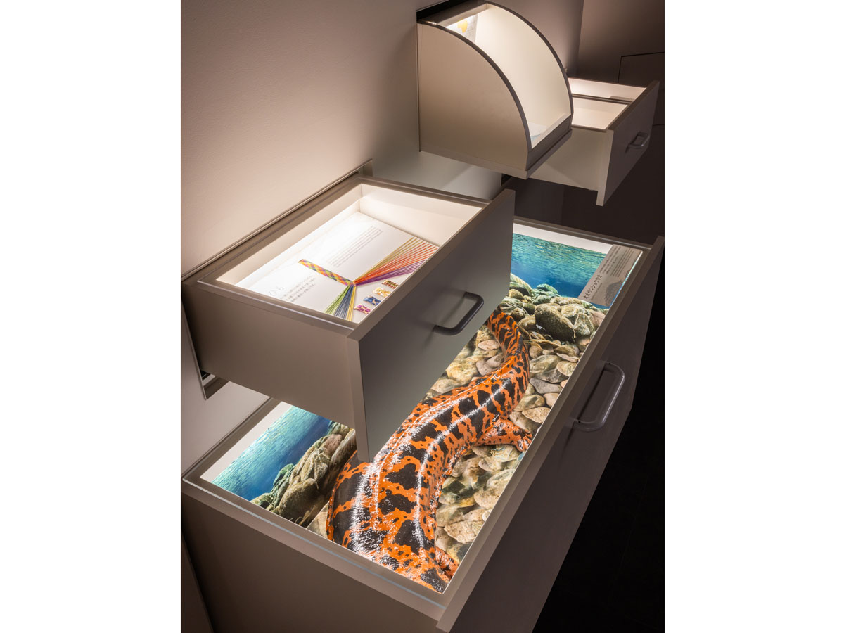 三重県は「北勢」「中南勢」「伊勢志摩」「伊賀」「東紀州」の5エリアに大きく分けられます。こちらのゾーンでは、各エリアそれぞれが持つ自然、観光、文化、祭り、食の魅力を縦3メートル・横13.5メートルの大型パネルが映し出す映像コンテンツを通して知ることができます。また、壁をよく見ると引き出しがあり、開けると手裏剣やオオサンショウウオの模型が出てきたり、伊勢茶の茶葉の香りをかいだりと、三重の魅力を、見て、触れて、感じることができる仕掛けも隠れています。楽しみながら各地域の多彩な見どころをチェックしましょう。 またこちらの場所では、「熊野古道」「常若(とこわか)」「自然」「歴史・文化」「産業」「食」の6つをテーマにした期間限定の特別展示が行われるので、見逃さないで。