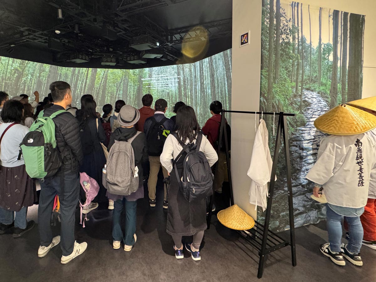 伊勢神宮と、熊野三山(熊野本宮大社、熊野速玉大社、熊野那智大社)を結ぶ世界遺産「熊野古道伊勢路」。「イマーシブ熊野古道」では、5面のスクリーンに、美しい石畳や雄大な自然など熊野古道を歩いているような臨場感のある映像を投影。川の音や鳥のさえずりといった自然音を流したり、ヒノキの香りを漂わせたりすることで、あたかも現地にいるかのような体験ができる没入型コンテンツで、熊野古道の魅力を堪能できます。