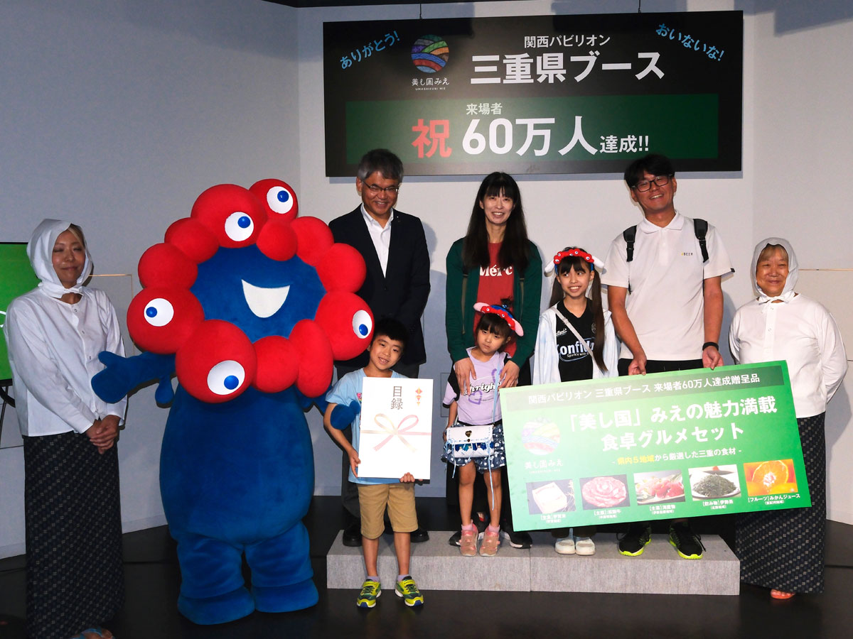 三重県ブースで、10月4日(土)に来場者数が60万人を達成しました。これを記念して、三重県ブース来場者60万人達成セレモニーを開催。記念すべき60万人目の来場者、和歌山県からお越しのご家族様には、アテンダントによる特別観覧ツアーに参加いただき、「美し国」みえの魅力満載食卓グルメセットを贈呈しました。